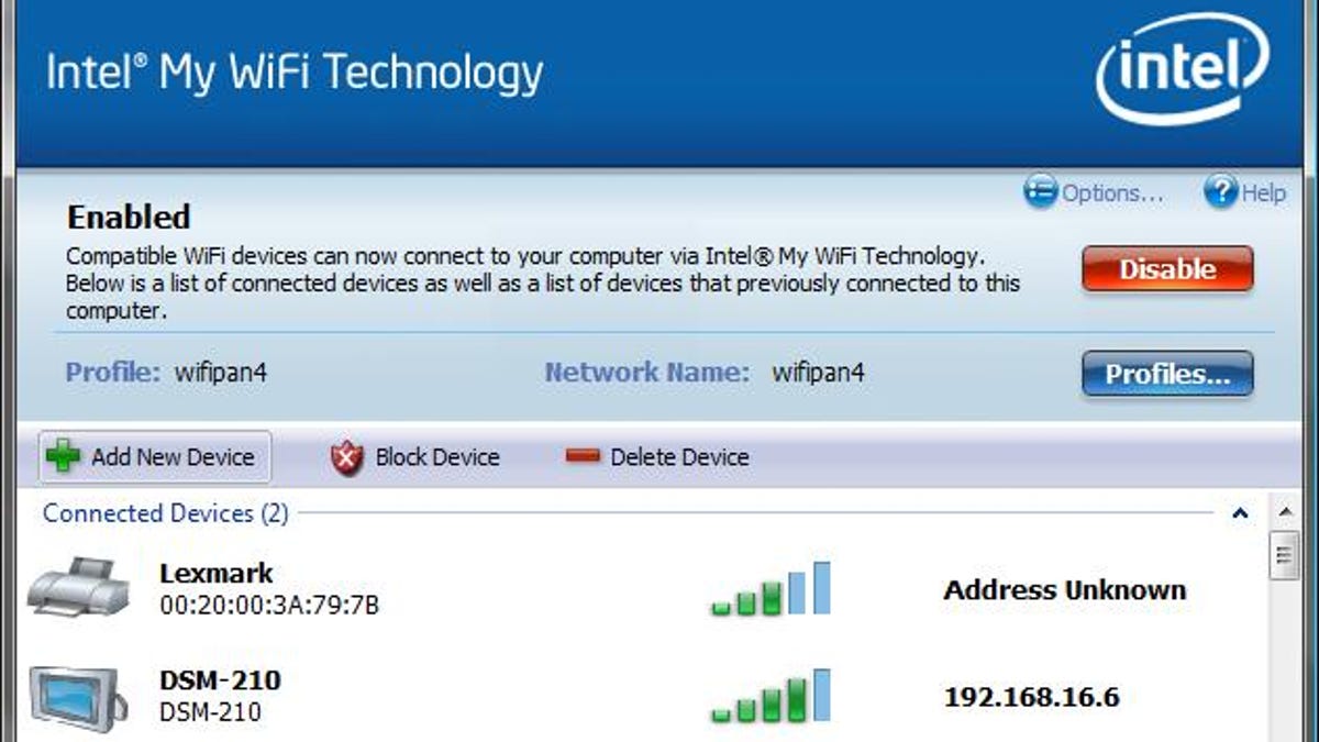 Intel's My WiFi technology supports multiple types of security protocols, including WEP, WPA, and WPA2. It also supports Wi-Fi Protected Setup, a technology that lets you add wireless clients to a network quickly without having to manually entering the encryption key.