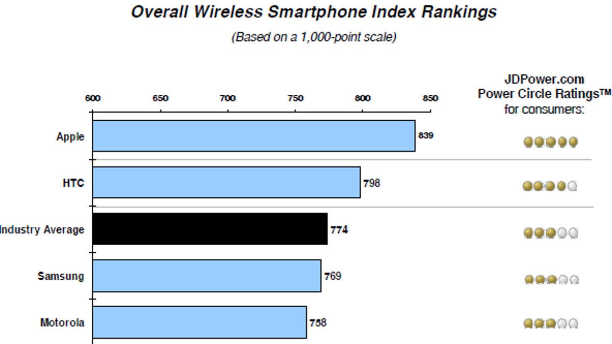 For the seventh consecutive time, Apple was tops among smartphone makers with a satisfaction score of 839 out of 1,000, according to results from J.D. Power's latest survey, which is done every six months. The company did well in all of the factors measured by the survey--performance, ease of operation, features, and physical design. But owners were most satisfied with the iPhone's features and ease of operation.