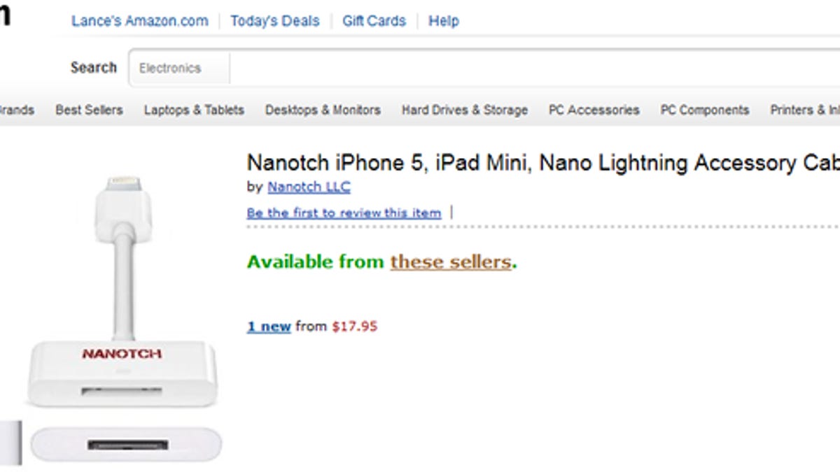 Amazon shows generic versions being sold through two companies -- Nanotch and iTronz. Nanotch is offering the 7-inch cable adapter for $17.95, a part that Apple sells for $39. iTronz is selling the smaller stub adapter for $9.99, for which Apple charges $29.