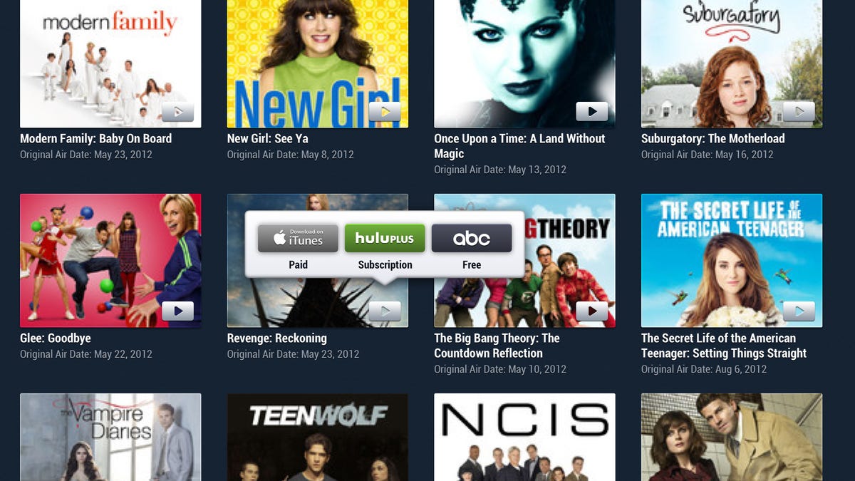 How does that work, exactly? TV Guide does it by offering a separate Watchlist area where searched-for shows will show every instance on TV listings, streaming services, and even on-demand cable channels. When you click the "streaming services" area, listings from other apps appear. Currently, the connected video apps are limited to ABC, ABC Family, CW, Hulu Plus, HBO GO, MAX GO, Crackle, and iTunes. Notably missing are Netflix and Amazon, although TV Guide's executives say that more services will be available in the coming weeks.