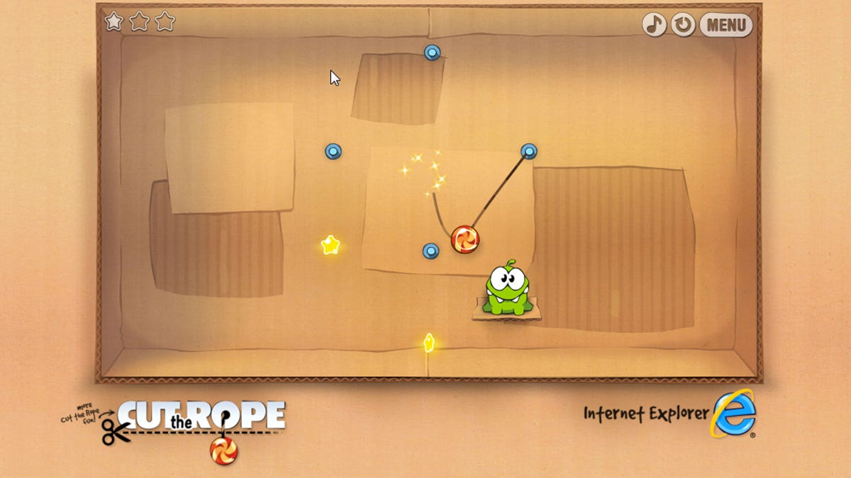 While Google has been getting the lion's share of press for porting popular mobile game apps to HTML5, most notably with Angry Birds, they're not the only company pushing the limits of the future-Web tech. To play the game, simply go to CutTheRope.ie. It ought to work in any browser that supports HTML5, although apparently in Firefox Microsoft has shifted the audio components to Flash.