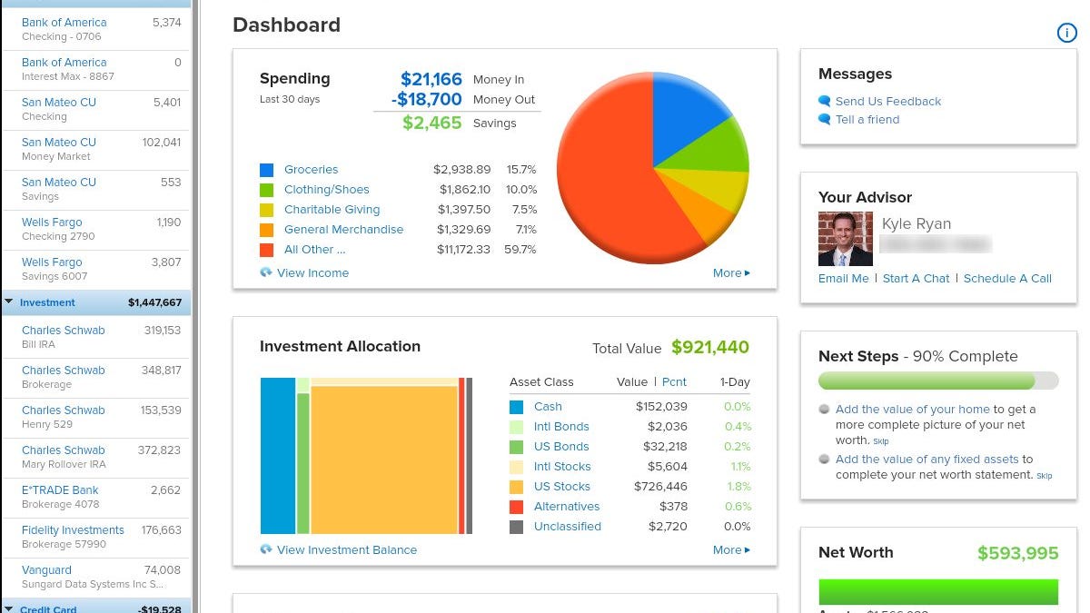 So he's trying to build instead a "complete solution" for the connected, sort-of-high-net-worth consumer: a product that gives Mint-like ease of use and information, but with a focus on giving these users grown-up insight. In particular, Personal Capital shows you your investment allocation across all your accounts, so you can see if you're, for example, too heavily invested in U.S. stocks vs. emerging market stocks, bonds, currencies, and so on.