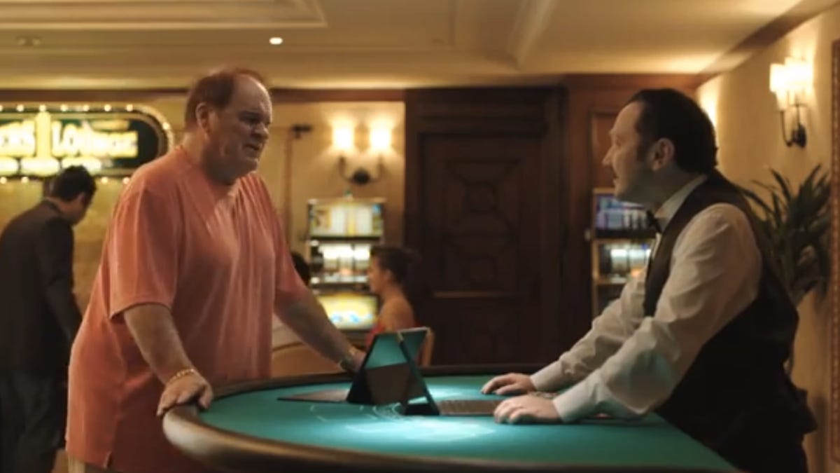 To win a shiny keychain, the player has to open a file from Microsoft Office with Google Docs "without data loss and format discrepancy," according to dealer Schneider. Of course, he fails, enduring the loss of his credibility and upcoming promotion. The video ends with Pete Rose stepping up to the table, but declining to play, saying, "It's too big a gamble, even for me."