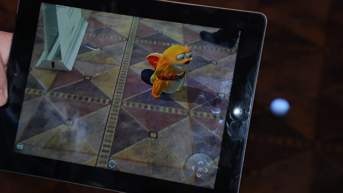 Take the Rolling Dead. It's a basic zombie game in which the zombies attack Sphero, which is rolling around the carpet while you play from your handheld (in this case on an iPad). The iPad's camera tracks the Sphero's position and orientation, letting you control it within a 50-foot range. There's a game called Sharky the Beaver, shown in the photo above, where the Shark also goes after Sphero.