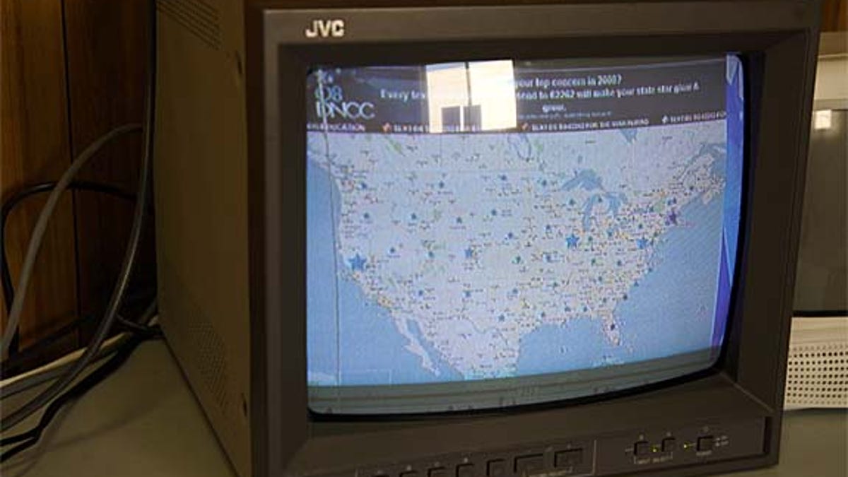 The more text messages originating from each state--presumably based on the sender's area code--the larger a star on the stadium's screens appear. Last we checked, California was in the lead.