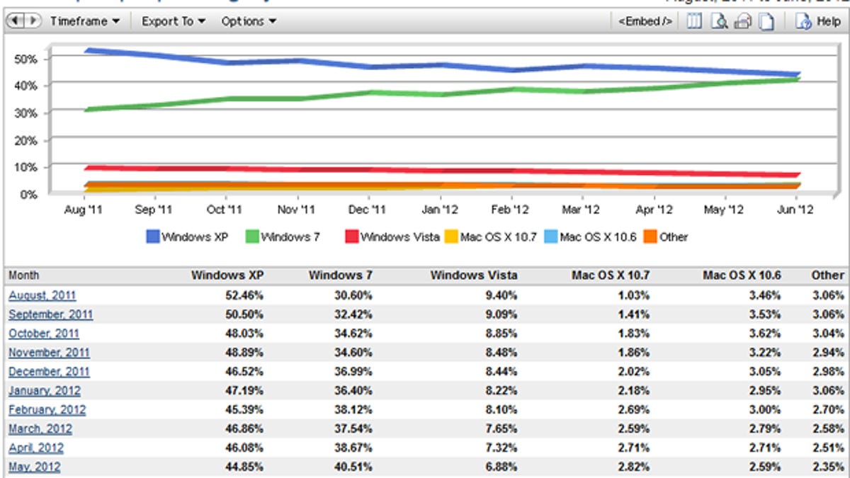 Windows 7 has almost consistently chewed off a greater market share each month, hitting 14 percent in June 2010 and 28.7 percent in June 2011. At same time, XP has tried to hang on to its dominant lead but has seen a gradual decline overtime. Over the past two years, XP's share has fallen from 64 percent in June 2010 to 54 percent a year ago, according to Net Applications.