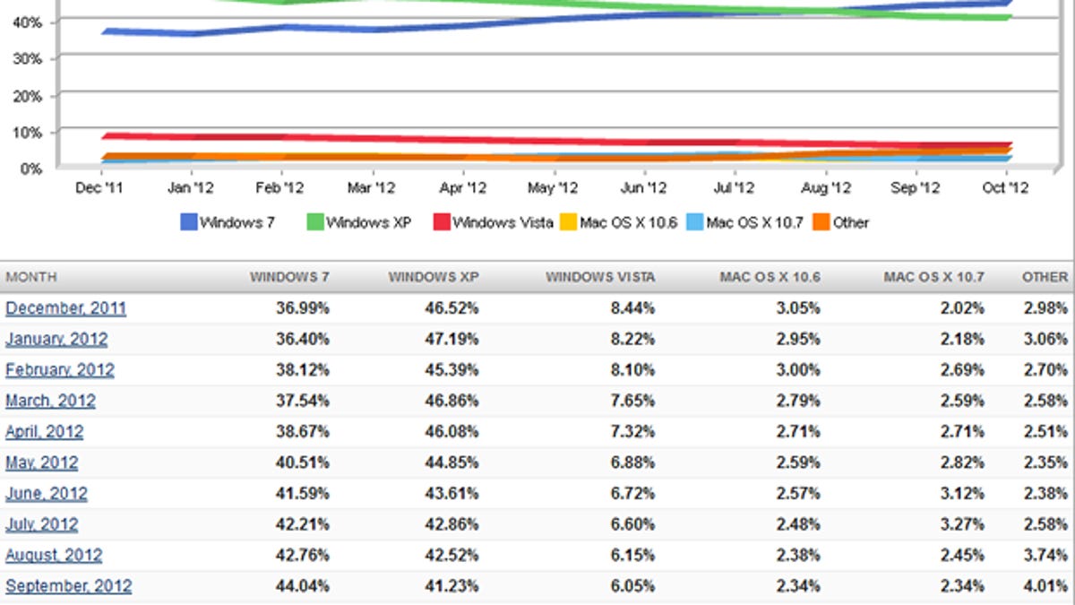 As recorded by Web tracker Net Applications, Windows 7 scored a market share of 44.7 percent last month, a slight gain from September's 44 percent. Over the same time, XP's share fell from 41.2 percent to 40.7 percent.