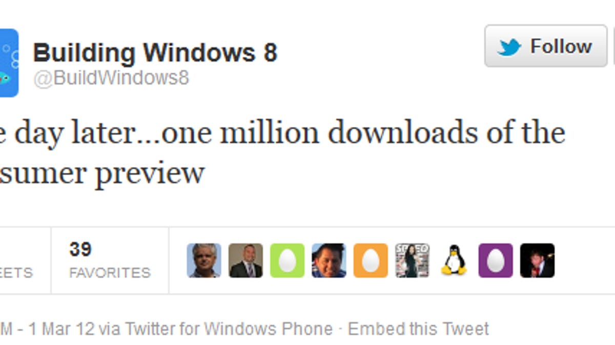 Proud parent Microsoft tweeted yesterday that 1 million copies had been downloaded since the beta hit the Web on Wednesday. The beta was released on the same day the company demoed the software at Mobile World Congress in Barcelona, Spain.